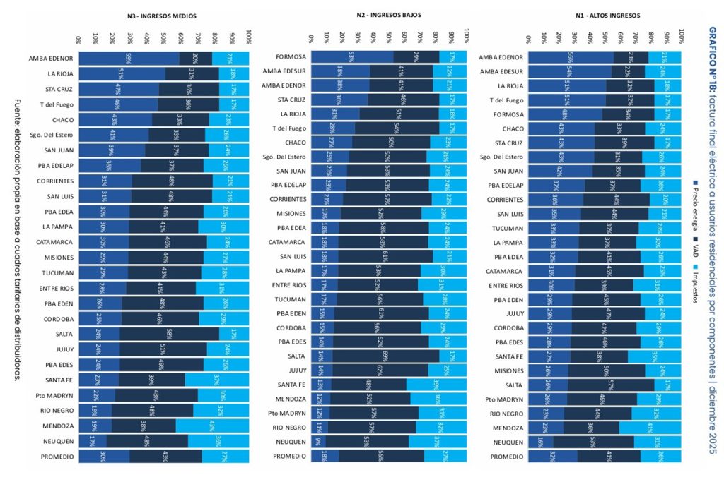 El informe proporcionado a 7Paginas, analiza en detalle la composición de la factura eléctrica, teniendo en cuenta el precio de la energía, el Valor Agregado de Distribución (VAD) y la carga impositiva. En ese marco, Entre Ríos presenta un nivel tarifario inferior al promedio nacional en los tres segmentos de usuarios evaluados: ingresos altos, medios y bajos. Este desempeño consolida un esquema de mayor equilibrio tarifario en comparación con otras provincias.