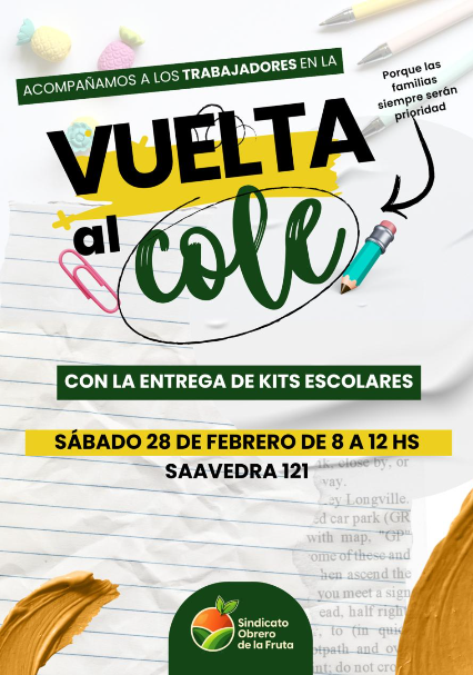 La iniciativa, denominada “Vuelta al Cole”, se concretará este sábado 28 de febrero, de 8 a 12 horas, en la sede sindical ubicada en calle Saavedra 121. Allí, los trabajadores afiliados con hijos en edad escolar podrán retirar los útiles correspondientes, en una medida que busca acompañar a las familias en el inicio de clases.