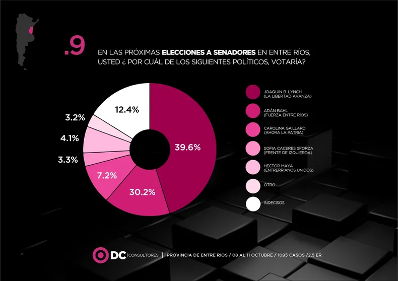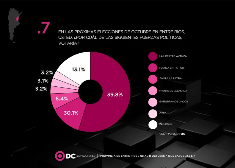 El relevamiento, que abarcó Paraná, Concordia, Gualeguaychú, La Paz, Chajarí, Diamante, Gualeguay y Concepción del Uruguay, incluyó 1.095 casos. El porcentaje de indecisos alcanza el 13,1%, mientras que la izquierda y Entrerrianos Unidos se ubican en torno al 3% cada uno.