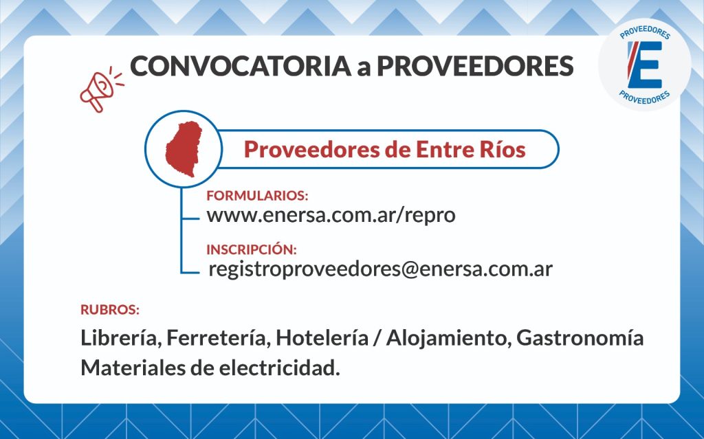 La inscripción de los futuros proveedores debe realizarse enviando la documentación por correo electrónico a registroproveedores@enersa.com.ar. Para más información, se puede consultar el sitio web www.enersa.com.ar/repro o la cuenta oficial @enersa.proveedores.