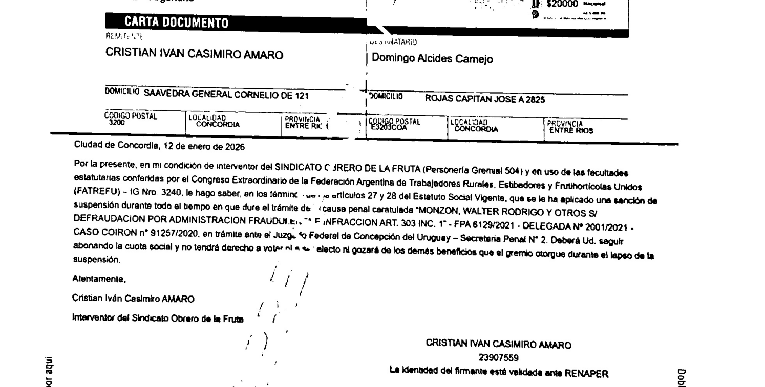 En el texto de la notificación se expresa: “Por la presente, en mi condición de interventor del Sindicato Obrero de la Fruta y en uso de las facultades estatutarias conferidas por el Congreso Extraordinario de la FATREFU, le hago saber, en los términos de los artículos 27 y 28 del estatuto social vigente, que se ha aplicado una sanción de suspensión durante todo el tiempo en que dure el trámite de la causa penal caratulada ‘Monzón Walter Rodrigo y otros / Defraudación por administración fraudulenta’”, entre otros conceptos.