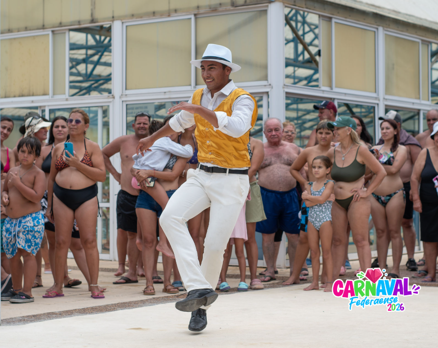 Durante la mañana de este lunes, el complejo termal —colmado de visitantes— fue escenario de una promoción especial a cargo de pasistas y ritmistas de la comparsa Samba Bera, quienes desplegaron ritmo, color y simpatía para invitar a los turistas a sumarse a la fiesta de esta noche.