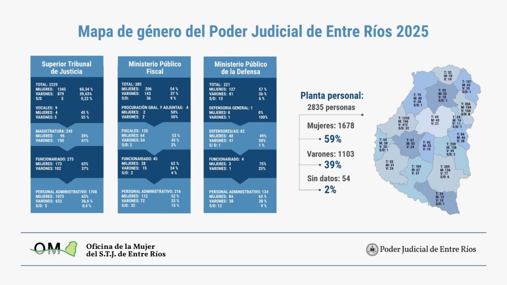 El Poder Judicial de Entre Ríos presentó los datos de su Mapa de Género 2025, un relevamiento realizado por la Oficina de la Mujer del Superior Tribunal de Justicia (STJ). El informe dado a conocer a 7Paginas, arroja una radiografía clara sobre la composición del sistema: de un universo de 2.835 personas, el 59% son mujeres (1.678 agentes), frente a un 39% de varones (1.103 agentes).