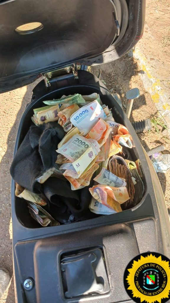 Al revisar el rodado, una motocicleta marca Keller 110 cc, los uniformados descubrieron que en la baulera se ocultaba una suma importante de dinero en efectivo, distribuida en billetes de distintas denominaciones.