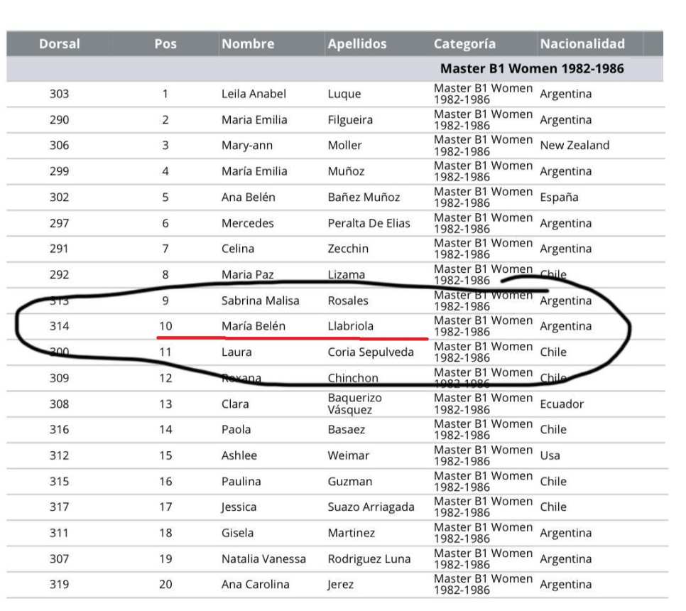 Análisis Técnico del «Bochorno» Finalistas Reales: Solo 8 ciclistas de las 22 inscriptas lograron completar el 100% del recorrido en el tiempo reglamentario. Ellas son las únicas que pueden ostentar un puesto en el «Top 10» genuino. La posición de Llabriola: La planilla oficial es irrefutable. María Belén Llabriola figura en el grupo de las competidoras con la sigla RET (Retirada).