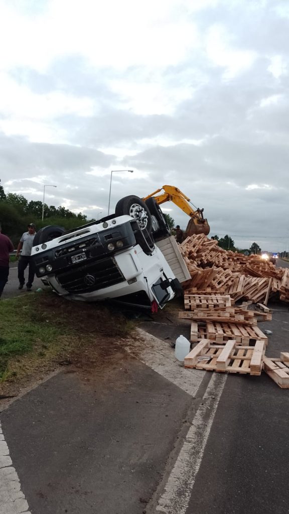 Por causas que se tratan de establecer, un camión con acoplado marca Volkswagen 17.220 que circulaba saliendo de Concordia e ingresando al empalme, volcó sobre su lateral izquierdo, desparramando sobre la cinta asfáltica la carga de pallets que transportaba.